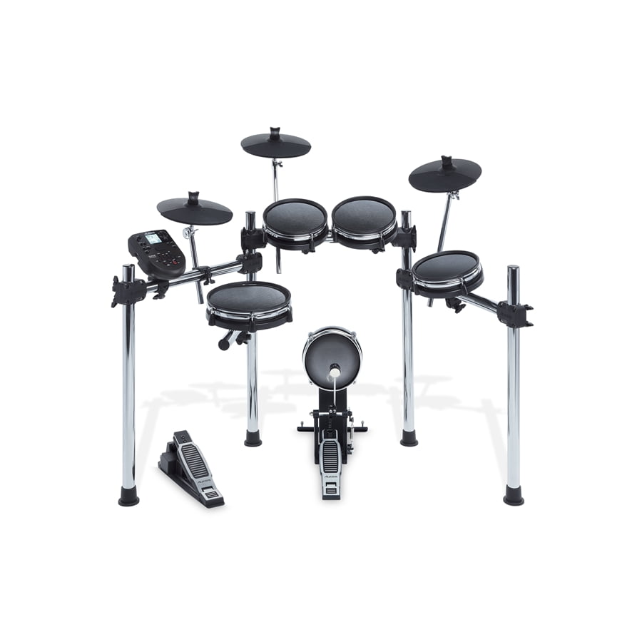 La dotazione di pad include un rullante mesh a doppia zona da 10”, tre tom a doppia zona da 8”, una cassa mesh da 8” montata su uno stand verticale con pedale incluso in dotazione e di tre piatti: un ride, un hi-hat e un crash con funzione choke (simulazione dello stoppato).